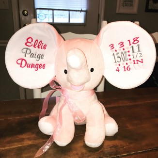 Display Their Name- Displaying Ellie Paige’s name makes me feel like she is not forgotten (which she never will be) and that she is apart of our family everyday. Her name is up in a wall gallery we made for her, I have an elephant with her name and birth information that I sleep with everynight (pictured below), and I have ordered the most beautiful print where they take her actual footprints and make them into a butterfly with her name. You can find this by clicking here Butterfly footprints