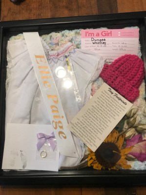 Shadowboxes- My mom and me made the shadow box shown with special items from Ellie Paige’s life: The gown and knitted hat she wore in the hospital, her blanket we held her in from the hospital, her birth card and hospital band, her tiny footprints, her name ribbon from her casket spray, dried flowers from her funeral, and a beautiful poem. We have her shadow box hung where I see it constantly. It brings a smile to my face knowing there is still pieces of her here with me.